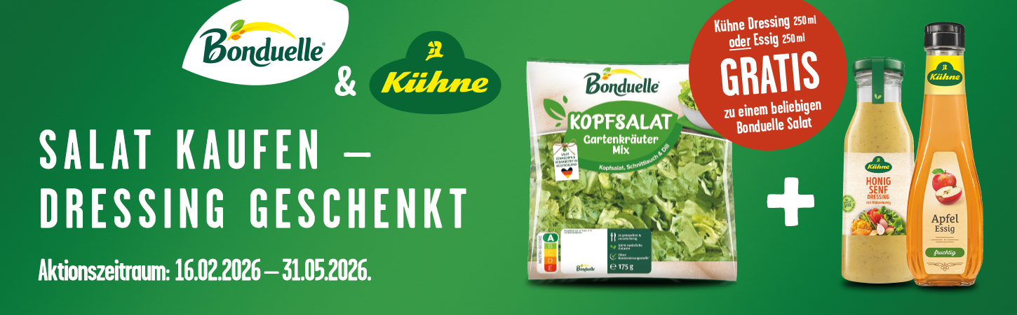 1. Beliebigen Bonduelle Salat & Kühne Dressing 250 ml oder Essig 250 ml kaufen.